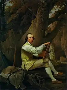 Many Scottish painters of the early part of the eighteenth century remained largely artisans. Roderick Chalmers' (fl. 1709–30) painting The Edinburgh Trades (1720) shows the artist himself, perhaps ironically, among the glaziers, wrights and masons of the burgh.[1] Thomas Warrender (fl. 1673–1713) produced the Allegorical Still Life (after 1708), of a letter board that seems to be a commentary on the union of 1707, but he made his living as a house decorator, working closely with architects, including William Adam.[2] He may have trained James Norie (1684–1757), who with his sons James (1711–36) and Robert (d. 1766), painted the houses of the peerage with Scottish landscapes that were pastiches of Italian and Dutch landscapes.[3] They tutored many artists and have been credited with the inception of the tradition of Scottish landscape painting that would come to fruition from the late eighteenth century.[4] The painters Allan Ramsay (1713–84), Gavin Hamilton (1723–98), the brothers John (1744–68/9) and Alexander Runciman (1736–85), Jacob More (1740–93) and David Allan (1744–96), mostly began in the tradition of the Nories, but were artists of European significance, spending considerable portions of their careers outside Scotland.[5] Henry Raeburn (1756–1823) was the most significant artist of the period to pursue his entire career in Scotland, born in Edinburgh and returning there after a trip to Italy in 1786.[6]