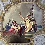 It is the largest of the rooms, enriched in all its parts by the most precious works. It is richly illuminated by the paintings on canvas of the ceiling by Giambattista Tiepolo which were executed from 1739 to 1744. The stuccoes are of the Swiss decorator Abbondio Stazio in 1740, gilded by Carpoforo Mazzeti from 1742 to 1743. In the hall there is an altar dedicated to the Virgin with a statue of the Madonna and Child offering the scapular, a 17th century work of Bernardo Falconi.