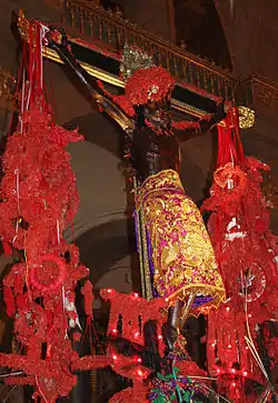 Señor de los Temblores (in Quechua known as Taytacha Temblores, meaning Christ or Lord of the Earthquakes) is a 16th-century statue of the crucifixion of Jesus in Cusco Cathedral in Cusco, Peru. It is popularly believed to have reduced damage in the city during the 1650 earthquake.[1] Taytacha Temblores became known as the patron saint of Cusco,[2] and is carried in procession annually on Holy Monday.