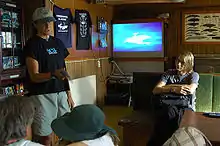 From the music industry, Anthony Kiedis of the Red Hot Chili Peppers, Leona Lewis, Rick Rubin, and the groups Hawkwind, The Red Paintings, Propagandhi, Gojira, Parkway Drive, Heaven Shall Burn, Stick to Your Guns, The Amity Affliction and Architects have financially supported Sea Shepherd.[20] Architects vocalist Sam Carter is also one of Sea Shepherd's British ambassadors.[63] Vegan straight edge band Earth Crisis and Zoltán Téglás of Ignite support SSCS, among other environmental organizations, dedicating songs such as "So Others Live" and "Ultramilitance" to them.[64][65] Giacomo "Josh" Giorgi, vocalist of now-defunct Italian straight edge hardcore band To Kill is the bosun's mate aboard the MY Steve Irwin.[66] In 2009, professional surfer Kelly Slater joined a Quiksilver Australia/Sea Shepherd partnership featuring a fund-raising clothing line, including board shorts designed by Slater.[67] In 2013 alt-metal band Klogr started supporting Sea Shepherd in Europe through the videos "Guinea Pigs" (2013) and "Zero Tolerance" (2014), featuring images from Sea Shepherd documentaries filmed in Taiji and other missions.