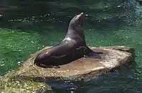 Sea lions are pinnipeds characterized by external ear flaps, long foreflippers, the ability to walk on all fours, short, thick hair, and a big chest and belly. Together with the fur seals, they comprise the family Otariidae, eared seals, which contains six extant and one extinct species (the Japanese sea lion) in five genera. Their range extends from the subarctic to tropical waters of the global ocean in both the Northern and Southern Hemispheres, with the notable exception of the northern Atlantic Ocean.[1] They have an average lifespan of 20–30 years. A male California sea lion weighs on average about 300 kg (660 lb) and is about 2.4 m (8 ft) long, while the female sea lion weighs 100 kg (220 lb) and is 1.8 m (6 ft) long. The largest sea lion is Steller's sea lion, which can weigh 1,000 kg (2,200 lb) and grow to a length of 3.0 m (10 ft). Sea lions consume large quantities of food at a time and are known to eat about 5–8% of their body weight (about 6.8–15.9 kg (15–35 lb)) at a single feeding. Sea lions can move around 16 knots (30 km/h; 18 mph) in water and at their fastest they can reach a speed of about 30 knots (56 km/h; 35 mph).[2] Three species, the Australian sea lion, the Galápagos sea lion and the New Zealand sea lion, are listed as endangered.[3][4][5]