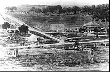 By 1854 the village comprised a post office, National School, Wesleyan Chapel, and an English Church.[10] Classified advertising from the time suggests the town was low-lying and scattered between the river and swampland.