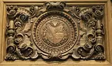 In 1876, the College switched from having its seal impress wax to having it impress paper. This required a second, "male" die to fit under the original.[3] The seal design was also carved in sandstone on the exterior of Rollins Chapel in 1886 (see above) and in wood on the interior of Commons in the Collis Center in 1901 (see right).