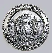 The Great Seal of the State of Hawaii was designated officially by Act 272 of the 1959 Territorial Legislature and is based on the territorial seal.[1] Modifications to the territorial seal included the use of the words "State of Hawaii" at the top and "1959" within the circle. Provisions for a seal for the state of Hawaii were enacted by the Territorial Legislature and approved by Governor William F. Quinn on June 8, 1959.[2] The passage of the Admission Act in 1959, admitted Hawaii as the 50th State of the United States of America on August 21, 1959.
