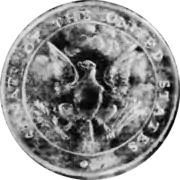 By 1830, the first Senate seal was either unserviceable due to wear or simply lost after a period of not being used. A new seal was commissioned from Robert G. Lanphier, Jr., a French artist, engraver and jeweler living in Washington D.C. at the time.[1] The press and counterseal were made by Edward Stabler, the postmaster at Sandy Spring, Maryland from 1830 until his death in 1883. Stabler had engraved the seal for the House of Representatives in 1830, and also would later make the seals for most federal government departments of the time, some states, and several municipalities.[2]