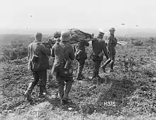 The New Zealanders' attack began with a night-time advance on 24 August by the 1st Infantry Brigade to clear the approaches to Bapaume, including Loupart Wood and Grévillers.[27] Brigadier General Charles Melvill, commanding the brigade, was directed to move onto Bapaume if it were able to do so quickly.[27] However, progress was delayed by heavy machine gun fire and artillery took its toll on the supporting tanks allocated to the brigade.[28] Furthermore, in contrast to the previous three days, the weather was poor.[29] Despite this, Grévillers fell to the brigade along with 380 prisoners and several field guns. There were over 100 casualties among the attacking New Zealanders, including the commander of 2nd Auckland Battalion.[30][Note 3]