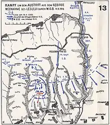 There is considerable disagreement between the German and Allied versions of the lead-up to the German breakthrough at the Jiu Valley. The Russian General Staff stated on 22 November that the German plan against Romania had completely failed, that Falkenhayn had failed at Predeal, and that he could only overrun Wallachia, instead of cutting it off in a pincer movement.[16] The German semi-official comment, however, claimed that it had never been the intention of their Supreme Command to break through in the southeastern Carpathian passes, trying to make out - in reaction to their defeats in the passes south of Brassó (Brașov) and on the Moldavian frontier - that these had always been part of a maneuver which aimed at attracting and binding Romanian forces in an area away from the Jiu Valley, the place singled out for the main attack. The truth was probably that the German Supreme Command acted on a plan which, if successful, would have achieved an overwhelming victory, but even if only partially carried out, would have given them the means to achieve remarkable though less overwhelming successes.[5]:435 With the eastern Carpathian passes eliminated, the southern route from Brassó (Brașov) to Bucharest and the Danube offered the greatest potential for crushing the Romanian Army. Both the German and Austro-Hungarian commands favored this approach. However, the Romanians expected their enemies to choose that route, and accordingly they had constructed formidable defenses in the passes south of the city before the war started. Taking into consideration the worsening weather and the situation of the railways, Erich von Falkenhayn decided to achieve his breakout in the westernmost mountain passes. That being said, Falkenhayn had not entirely given up hope of breaking through the Romanian defenses south of Brassó (Brașov). He sent his divisions east and south of the city to both keep pressure on the Romanians and — with luck — break through the Romanian defenses. General Curt von Morgen, one of Falknehayn's subordinates, argued that much more of the Romanian Army could have been captured if a breakthrough would have been achieved at Câmpulung instead of the Jiu Valley. He insisted that this would have achieved "a real victory, a Cannae, a Tannenberg".[4]:156–157, 300 Falkenhayn planned to apply pressure at several different points across the mountains and then exploit a success wherever it was achieved.[6]:370–371