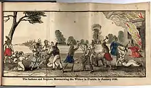 January 1837 saw a change in the war. In various actions a number of Seminoles and Black Seminoles were killed or captured. At the Battle of Hatchee-Lustee, the Marine brigade captured between thirty and forty Seminoles and blacks, mainly women and children, along with 100 pack ponies and 1,400 head of cattle. At the end of January some Seminole chiefs sent messengers to Jesup, and a truce was arranged. Fighting did not stop right away, and a meeting between Jesup and the chiefs did not occur until near the end of February. In March a 'Capitulation' was signed by a number of chiefs, including Micanopy, stipulating that the Seminoles could be accompanied by their allies and "their negroes, their 'bona fide' property" in their relocation to the West.[42]
