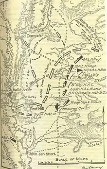 Posts held by the Ottoman cavalry formed a defensive line extending across the valley from Umm esh Shert.[91] This defensive line formed a line of communications, linking the German and Ottoman forces in the Fourth Army west of the Jordan River with the VIII Corps defending Shunet Nimrin. These defensive posts were attacked by the 4th Light Horse Brigade mounted, and driven back towards Mafid Jozele 4.5 miles (7.2 km) north of Umm esh Shert.[51][91] While the 3rd and 4th Light Horse Brigades continued northwards the 1st Light Horse Regiment (1st Light Horse Brigade) was ordered to attack the German and Ottoman force on Red Hill about 6,000 yards (5,500 m) north-east of Umm esh Shert.[92]