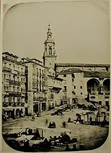 The San Miguel clock is now a distinctive element of the bell tower of the Church of San Miguel, this bell tower is seen in the foreground in the square. Now, originally this clock was not in the tower. It was in this neighboring tower, crowning the structure of the Portal of the Correría Street.