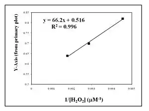 The y-intercept is determined at several different fixed concentrations of substrate B (and varying substrate A). The y-intercept values are then plotted versus 1/[B] to determine the Michaelis constant for substrate B, , as shown in the Figure to the right.[3] The slope is equal to divided by and the intercept is equal to 1 over .