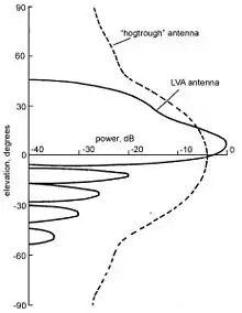 The early system used an antenna known as a hogtrough. This has a large horizontal dimension to produce a narrow horizontal beam and a small vertical dimension to provide cover from close to the horizon to nearly overhead. There were two problems with this antenna. First, nearly half the energy is directed at the ground where it is reflected back up, and interferes with, the upward energy causing deep nulls at certain elevation angles and loss of contact with aircraft. Second, if the surrounding ground is sloping, then the reflected energy is partly offset horizontally, distorting the beam shape and the indicated bearing of the aircraft. This was particularly important in a monopulse system with its much improved bearing measurement accuracy.[10]