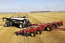 Drilling or seeding are the terms used for the mechanized sowing of an agricultural crop. Traditionally, a seed drill consists of a hopper filled with seeds arranged above a series of tubes that can be set at selected distances from each other to allow optimum growth of the resulting plants. Seeds are spaced out using fluted paddles which rotate using a geared drive from one of the drill's land wheels. The seeding rate is altered by changing gear ratios. Most modern drills use air to convey seeds in plastic tubes from the seed hopper to the colters. This arrangement enables seed drills to be much wider than the seed hopper — as much as 12m wide in some cases. The seed is metered mechanically into an air stream created by a hydraulically powered onboard fan and conveyed initially to a distribution head which sub-divides the seeds into the pipes taking the seeds to the individual colters.