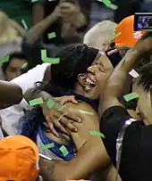 During her collegiate career with the LSU Lady Tigers, the two-time All-American[6] won the Naismith College Player of the Year,[7] Wooden Award and Wade Trophy in 2005 and 2006 while leading the LSU to three straight Final Four appearances.[8] The Lady Tigers however, never advanced beyond the semi-final round. She averaged 19.3 points, 5.2 rebounds and 2 assists per game in her collegiate career. During her final year, she won the Lowe's Senior CLASS Award, recognizing her as the nation's top senior women's basketball player. Augustus graduated from Louisiana State University in 2006. Her uniform number (33) was retired by LSU on January 9, 2010, making her the first female athlete in school history to receive that honor.[9] Augustus had also played with future WNBA teammate Sylvia Fowles during her collegiate career at LSU.