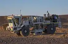 Vibratory sources (also known as Vibroseis) are the most commonly used seismic sources in the oil and gas industry. An aspect that sets this type of source apart from explosives or other sources is that it offers direct control over the seismic signal transmitted into the subsurface i.e. energy can be transmitted into the subsurface over a known range of frequencies over a specified period of time.[5] Vibratory sources typically host trucks that are mounted with heavy plates which repeatedly hit the ground to transmit seismic energy to the subsurface. [6] The figure on the right shows one such Vibroseis, known as the Nomad 90. Vibratory sources are often employed where vast areas need to be explored and where the acquisition region does not feature densely populated or densely vegetated areas; highly varying topography also inhibits the employment of vibratory sources. [7] Additionally, wet regions are also suboptimal for vibratory source use since these trucks are extremely heavy and hence tend to damage property in wet terrains. [7]