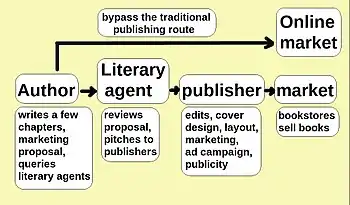 - True self-publishing. The author controls the entire publishing process from start to finish, and can hire freelancers to help with wherever the author requires, such as cover designers, copy editors, and story editors. It is necessary for the author to think like an entrepreneur and take charge of all variables, and as much as possible, get the finished book to look like a quality product. All profits and rights stay with the author but it is nearly impossible to get the book into bookstores unless it becomes a breakout bestseller, which is highly unlikely. Authors can sell their e-books through online platforms, and can distribute them through e-book distributors or print-on-demand firms.[36]