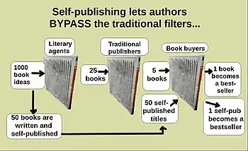 The $1 billion market of self-publishing has transformed in the past two decades with new technologies providing increasing alternatives to traditional publishing.[1] Self-publishing is increasingly becoming the first choice for writers.[2] Most self-published books sell very few copies.[3] Those which sell large numbers are newsworthy because they are so rare. The quality of self-published works varies considerably, because there are no barriers to publication and no quality control.[4]