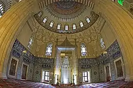 This grand mosque stands at the center of a külliye (complex of a hospital, school, library and/or baths around a mosque) which comprises a medrese (Islamic academy teaches both Islamic and scientific lessons), a dar-ül hadis (Al-Hadith school), a timekeeper's room and an arasta (row of shops). In this mosque Sinan employed an octagonal supporting system that is created through eight pillars incised in a square shell of walls. The four semi domes at the corners of the square behind the arches that spring from the pillars, are intermediary sections between the huge encompassing dome (31.25 metres (102.5 feet) diameter with spherical profile) and the walls.