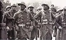 The Senegalese Tirailleurs (French: Tirailleurs Sénégalais) were a corps of colonial infantry in the French Army. They were initially recruited from Senegal, French West Africa and subsequently throughout Western, Central and Eastern Africa: the main sub-Saharan regions of the French colonial empire.[1] The noun tirailleur, which translates variously as "skirmisher", "rifleman", or "sharpshooter", was a designation given by the French Army to indigenous infantry recruited in the various colonies and overseas possessions of the French Empire during the 19th and 20th centuries.[2]