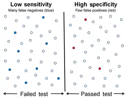 It is often claimed that a highly specific test is effective at ruling in a disease when positive, while a highly sensitive test is deemed effective at ruling out a disease when negative.[14][15] This has led to the widely used mnemonics SPPIN and SNNOUT, according to which a highly specific test, when positive, rules in disease (SP-P-IN), and a highly 'sensitive' test, when negative rules out disease (SN-N-OUT). Both rules of thumb are, however, inferentially misleading, as the diagnostic power of any test is determined by both its sensitivity and its specificity.[16][17][18]