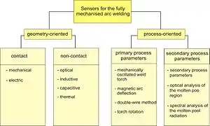 The quality of a weld depends, besides the weld parameters which are important for the welding process (e.g. voltage, current, wire feed and weld speed) also mainly from the type of input of process energy and of the used filler material. The positioning of the torch exerts a direct influence on the material flow. The heat input for the melting of the component edges and the steady heat flow are, furthermore, directly connected with the torch guidance and exert substantical influence on the weld quality and on the resulting residual stresses. In fully mechanised and automated shielded gas welding, the inaccuracies of torch guidance, workpiece handling, groove preparation and thermal distortion are adding to the variations of the edge position and edge geometry. In fully mechanised welding, the information which is required for the weld quality is detected via sensors. Sensors are applied for checking the position of the component (detection of weld start and end of weld), for joint tracking and for the adaptation of the process parameters to changes of the joints/grooves. It is possible to use the sensors online (together/at the same time with the welding process) or offline (in a separate working step before welding). Sensors are mainly used in online joint tracking.