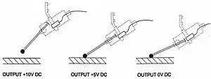 Due to the required distance of the acting/break points in one level, transformers which are equipped with micro-switches have a control hysteresis in the working point which has the consequence of a restricted reproducible accuracy. Electric displacement of the working point is not possible. The other, above-mentioned transformer systems (the use of optical systems is probably limited due to design reasons) produce analogous signals in proportion to the scanning element deflection and allow thus the error-proportional weld head tracking and also the electric working point displacement through the superordinate control, e.g. in multiple layer welding. The output signals of the most commonly used inductive measuring transformer systems are between 0 and 10 V DC, depending on the scanning element deflection (Figure 2).