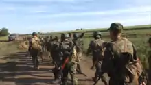 It is widely believed that the separatists are supported by the Russian Armed Forces.[13] Although the Russian government often denies direct involvement, stating that their soldiers were there voluntarily and not under orders, some of them were captured with documants that said otherwise.[14] The separatists have admitted receiving supplies from Russia and being trained there. BBC reported that separatist ranks are composed of thousands of Russian citizens.[14][15] Registered Cossacks of the Russian Federation have been reported to also be supporting the separatists. DPR head Alexander Zakharchenko claimed in August 2014 that there are around 3,000 to 4,000 Russian volunteers fighting for the militia, which includes current and many retired Russian Army servicemen.[16]