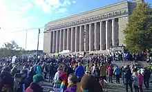 On 27 September, at least 85 Canadian cities and towns participated in climate strike actions.[54] Over 100,000 people turned up to a demonstration in Vancouver and another 20,000 in Victoria.[55] The school districts of Vancouver and Surrey permitted students to join the march, provided they had parental approval. 600 students from the University of Calgary skipped morning classes in order to join a rally near city hall.[56] Crowd sizes in Ottawa exceeded those on Canada Day celebrations. Some people chanted their slogans in both official languages of English and French.[54] In Halifax, Nova Scotia, more than 10,000 protesters marched through the downtown area.[57] In Edmonton, Alberta, thousands protested near the provincial legislature, but stopped short of criticizing the fossil fuel industry. Some even expressed their love for it.[54] Montreal Mayor Valérie Plante declared public transit in her city was free on the date of the protest and awarded Greta Thunberg the keys to the city.[58] In a remark made while welcoming Thunberg to city hall, she repeated her plan to reduce carbon emissions by 55% by 2030 and finally carbon neutral by 2050. Montreal's transit authority (STM) shared a map on social media showing which areas to avoid due to construction work, which Metro stations to get on and off, and where bus services were disrupted by the climate march.[59] Organisers claimed that half a million people joined the march in Montreal. While city officials initially estimated that number to be around 315,000,[22] Mayor Plante later stated that 500,000 people indeed took part in the march.[59] The turnout in Canada altogether may have been one million or more.[60]