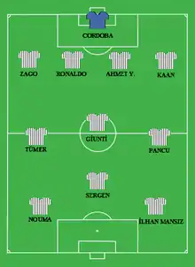 Returned to Beşiktaş in 2002.[10] Beşiktaş's top goal scorer of the squad which, became the champion in its 100th year. In the match played between Beşiktaş and Galatasaray in the 33rd week of the season, he scored the goal that brought the 100th year championship, and he realized the classic saying of Ercan Taner; "Sergen scored, championship came".[11] He was selected as one of the best footballers of 100 years in 2003 as a result of the votes cast by the directors, media representatives and fans who were members of the Board of Directors, and the Board of Directors at Beşiktaş JK.[12] In 2003 Player of the Year in Turkey has been selected.[13] October 1, 2003 Chelsea-Besiktas in the Champions League group game Sergen Yalcin's 2 goals led the throw to break a lot of records Besiktas and Turkey.[14][15][16] In the 2003-04 season, with the Beşiktaş shirt, he got close to the penalty broadcast against Çaykur Rizespor with the ball he won from the back of the middle field and completed with a scoring goal with İlhan Mansız, he won the "Goal of the Year" award.[17] He came to Besiktas in 2002 and left in 2006.[18] He became one of the rare midfielder players, who exceeded 100 goals in the league. From the British press, in September 2017 These Football Times published an article entitled "Sergen Yalçın: The man who could have been the world's best."[7][19] He is the coach of Beşiktaş JK.[10]
