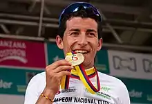 Henao started the year by winning the Colombian National Road Race Championships. In March he won the Paris–Nice race by a gap of two seconds after managing to fend off a final-day attack from Trek–Segafredo's Alberto Contador.[22] Contador had trailed by 31 seconds overnight, but had gone clear with Quick-Step Floors rider David de la Cruz and Marc Soler of the Movistar Team; after taking a couple of seconds at an intermediate sprint, Contador was beaten to the line in Nice by de la Cruz, which cost him four bonus seconds and decided the race in favour of Henao.[23]
