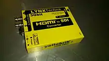 Serial digital interface (SDI) is a family of digital video interfaces first standardized by SMPTE (The Society of Motion Picture and Television Engineers) in 1989.[1][2] For example, ITU-R BT.656 and SMPTE 259M define digital video interfaces used for broadcast-grade video. A related standard, known as high-definition serial digital interface (HD-SDI), is standardized in SMPTE 292M; this provides a nominal data rate of 1.485 Gbit/s.[3]