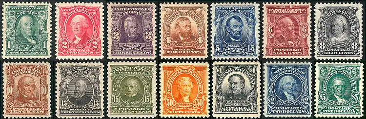 The Series of 1902, also known as the Second Bureau Issue, is a set of definitive postage stamps in fourteen denominations ranging between one cent and five dollars, produced by the U. S. Bureau of Engraving and Printing and issued by the United States Post Office. Two denominations appeared in November and December 1902 and the other twelve were released between January and June 1903. These stamps were assigned the Scott Catalogue numbers 300 through 313.[1] Also considered part of the series is a fifteenth stamp which appeared in November 1903—a second version of the 2¢ value (Scott #319),[1] the original having faced severe criticism. This series, particularly noted for its exceptional ornateness and opulence of design,[2] remained in circulation until late 1908, when it was superseded by the Washington-Franklin Issues.