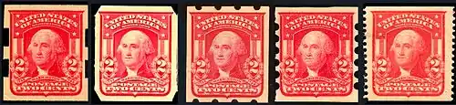 - The early years of the 20th Century saw the development of technologically and commercially viable stamp-vending and stamp-affixing machines; and this phenomenon had important effects upon methods by which several stamps in the 1902 series were produced--particularly as regards perforation. Because it proved impossible to devise machines that could reliably handle the 100-stamp panes of perforated stamps normally offered by the Post Office, vending manufacturers asked the Post Office instead for imperforate sheets of 400, which they would then cut into strips and incise with special types of private perforations that were more easily handled by machine. Accordingly, the Post Office produced imperforate versions of the 1¢ and 2¢ stamps (both released in October 1906),[18] with imperforate 4¢ and 5¢ stamps following in 1908. (These were the first imperforate postage stamps issued by the U. S. since 1856.) Also in 1908, the Post Office experimented with issuing coil strips of 1¢, 2¢ and 5¢ stamps for use in selected vending machines. The 5¢ issue appeared only in "vertical coils" (i. e., the coil was a single stamp wide, each stamp was imperforate on both its left and right sides, while perforations separated the bottom of each stamp from the top of the one below it); the 1¢ and 2¢ values, however were each offered both as "vertical coils" and "horizontal coils" (stamps side-to-side separated by perforations, imperforate top and bottom). For two reasons, these 1908 coils stand among the great rarities of philately: first because relatively small numbers of them were produced in the few months before the 1902 series was withdrawn from sale; second because coils were so novel a phenomenon that philatelists and stamp dealers did not yet recognize them as separate collectible varieties and so, made no effort to acquire them (surely some stamps were discarded that collectors and dealers might have preserved a year or two later). Even the most common of the 1908 coils, the 2¢ horizontal variety, fetches at least $2,500 U. S., and all the others are considerably more valuable, with the inordinately scarce 1¢ vertical coil cataloguing at above $100,000 and the even rarer 2¢ vertical coil valued at perhaps five times that much. With one exception, all of these coil and imperforate versions received separate Scott Catalogue numbers (314-318;320-322).[1]