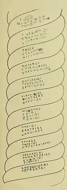 Pseudo-Demosthenes[5] gives a significantly different account of the train of events. In a speech, "Against Neaira", the orator recalls the conduct of Pausanias after the defeat of the Persians in the battle of Plataea over the Serpentine column: "Pausanias, King of the Lacedaemonians, caused a diptych to be inscribed on the tripod at Delphi, [which those Greeks, who had fought as allies in the battle of Plataea and in the naval engagement at Salamis had together made from the spoils taken from the Barbarians and had set up in honour of Apollo as a memorial to their bravery], as follows: 'Pausanias, commander-in-chief of the Greeks, when he had destroyed the army of the Medes dedicated this memorial to Phoebus (Apollo)', as if the work and the offering were his alone, and not from the allies together. The Greeks were enraged and the Plataeans obtained leave to bring a suit, on behalf of the allies, against the Lacedaemonians for 1,000 talents at the Amphictyonic council;[lower-alpha 3] and they compelled the Lacedaemonians to erase the inscription and inscribe the names of those cities which had shared in the work".