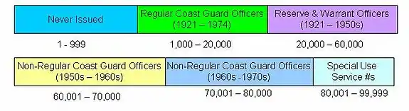 Coast Guard officer service numbers were unique amongst the military branches in that the entire range of officer numbers was declared upon the initial creation of the service numbers. The officer range extended from #1 to 100,000 and these numbers had yet to be exhausted by the discontinuation of Coast Guard service numbers in 1974.