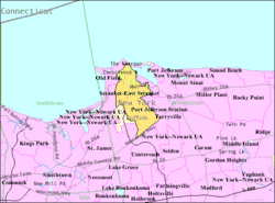 Setauket /səˈtɔːkɪt/ is a census-designated place (CDP) in Suffolk County, New York, on the North Shore of Long Island. As of the 2010 United States Census, the CDP population was 15,477.[1] The CDP encompassed the hamlets of Setauket (formerly West Setauket) and East Setauket. It was founded in 1655, the first settlement in what would become the Town of Brookhaven. As of 2020, Setauket-East Setauket was split into two separate CDPs called Setauket and East Setauket.[2]