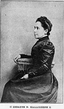 Sevasti Kallisperi was born in 1858 in Athens to Nicholas and Marigo Kallisperi. Her father, originally from Kalymnos, was an officer in the Greek War of Independence and after the establishment of the modern Greek state held several prominent positions, including Inspector of the Public Schools of Samos (1830), where he founded several primary schools; judge of Athens (1844); and the Prefect of Messenia (1855). The couple had three children and were staunch supporters of education.[1] Kallisperi's brother George would also become a soldier and later served in the 1897 Greco-Turkish War.[2]
