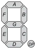 The segments are referred to by the letters A to G, where the optional decimal point (an "eighth segment", referred to as DP) is used for the display of non-integer numbers.[16][14] A single byte can encode the full state of a 7-segment-display including the decimal point. The most popular bit encodings are gfedcba and abcdefg. In the gfedcba representation, a byte value of 0x06 would turn on segments 'c' and 'b', which would display a '1'.