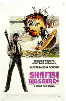Shaft's Big Score! is a 1972 American blaxploitation action-crime film starring Richard Roundtree as private detective John Shaft.[4] It is the second entry in the Shaft film series, with both director Gordon Parks and screenwriter Ernest Tidyman reprising their roles from the first film. Actors Moses Gunn and Drew Bundini Brown also return from the previous film, alongside new appearances from acting veterans Joseph Mascolo, Julius Harris, and Joe Santos.[4] Composer Isaac Hayes was unavailable (though he did contribute the song "Type Thang" to the film), so Parks, himself a musician, composed and performed the score himself.
