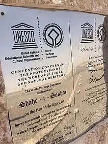 Plaque identifying Shahr-e Sukhteh registered as a UNESCO World Heritage Site