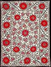 Shakhrisabz Suzani is a type of Suzani textile made in Uzbekistan. The best-known and most valuable Shakhrisabz Suzanis were made in the 19th century, as a part of the bride's dowry.[1] Shakhrisabz in an important market center in Kashkadarya Province of Uzbekistan and the textiles are an important source of income.