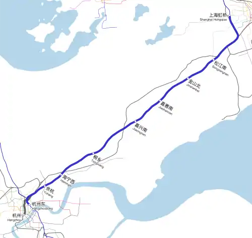 The Shanghai–Hangzhou high-speed railway (Chinese: 沪杭客运专线 or 沪杭高速铁路), also known as the Huhang high-speed railway or Huhang passenger railway is a high-speed rail line in China between Shanghai and Hangzhou, Zhejiang. The line is 202 km (126 mi) in length and designed for commercial train service at 350 km/h (217 mph). It was built in 20 months and opened on October 26, 2010. The line shortened travel time between the two cities from 78 to 45 minutes.[1] The line is also used by trains departing Shanghai's terminals for Nanchang, Changsha, Guiyang, and Kunming making it part of the Shanghai–Kunming High-Speed Railway. It has made the proposed Shanghai–Hangzhou Maglev Line unlikely.