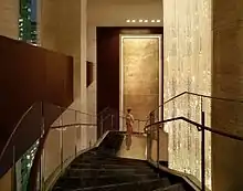 The New York Times described the hotel as "lavish" with a "discreet entrance" that whisks visitors to a lobby "dotted with fresh orchids, cascading chandeliers and plush sofas - to recreate a resortlike feel, high above the city’s chaos."[14]