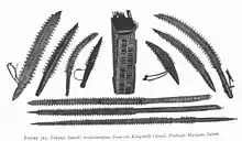 In Oceania and America, shark teeth were commonly used for tools, especially on weapons such as clubs and daggers, but also as blades to carve wood and as tools for food preparation. For example, various weapons edged with shark teeth were used by the Native Hawaiians (see example here[21]), who called them leiomano.[22] Some types were reserved for royalty.[23] The Guaitaca (Weittaka) of coastal Brazil tipped their arrows with shark teeth.[24] The remains of shark tooth-edged weapons, as well as chert replicas of shark teeth, have been found in the Cahokia mounds of the upper Mississippi River valley, more than 1,000 km (620 mi) from the ocean.[25] It is reported that the rongorongo tablets of Easter Island were first shaped and then inscribed using a hafted shark tooth.[26]