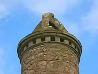 The Shaw Monument, sometimes known as 'Shaw Tower', located on rising ground (NS 36778 26122) near the Prestwick Airport Control Tower, was built at some point prior to 1775[2] by the then laird of Shaw, a keen falconer,[3] in order that he could follow the sport from its top in his old age when he was no longer able to join on horseback.[4][5] A faint portrait or simulacrum of a man in profile holding a falcon on a panel at the base of the tower may support this theory or may have given rise to it. The tower is a category B listed building.[6]