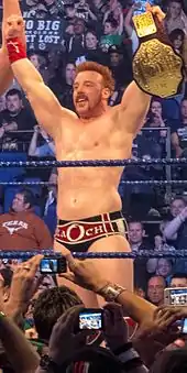 On 7 March, after losing a match against Daniel Bryan, Sheamus challenged him to a rematch with his WWE career on the line against Bryan's United States Championship.[98] He won his match against Bryan the following week, winning his first United States title.[99] The rematch between Sheamus and Bryan took place on 3 April, during the pre-show of WrestleMania XXVII, and ended in a draw after interference from the lumberjacks.[100] The next night on Raw, Sheamus retained the United States Championship against Bryan in a rematch.[101] In the 2011 Supplemental Draft, Sheamus was drafted to the SmackDown brand, and made his SmackDown debut on 29 April by attacking Kofi Kingston. He brought the United States Championship to SmackDown, but lost it back to the Raw brand at Extreme Rules when Kingston defeated him in a Tables match.[102][103]