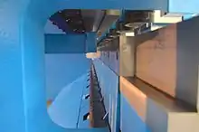The machine used is called a squaring shear, power shear, or guillotine. The machine may be foot powered, less commonly hand powered, or mechanically or hydraulically powered. It works by first clamping the material with a ram. A moving blade then comes down across a fixed blade to shear the material. For larger shears the moving blade may be set on an angle or "rocked" in order to shear the material progressively from one side to the other; this angle is referred to as the shear angle. Setting the blade on an angle decreases the amount of force required, but increases the stroke. A 5-degree shear angle decreases the force by about 20%. The amount of energy used is still the same. The moving blade may also be inclined 0.5 to 2.5°, called the rake angle, to keep the material from becoming wedged between the blades. However, raking the blade compromises the squareness of the edge.[4] The machine consists of a shear table, work-holding device, upper and lower blades, and a gauging device. The shear table is the part of the machinery that the workpiece rests on while being sheared. The work-holding device is used to hold the workpiece in place and keep it from moving or buckling while under stress. The upper and lower blades are the piece of machinery that actually do the cutting, while the gauging device is used to ensure that the workpiece is being cut where it is supposed to be.