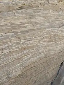 A shear zone is a zone of strong deformation (with a high strain rate) surrounded by rocks with a lower state of finite strain. It is characterised by a length to width ratio of more than 5:1.[1]