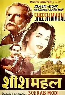 Sheesh Mahal (Palace of Mirrors) is a 1950 social Urdu/Hindi film produced and directed by Sohrab Modi for Minerva Movietone. The story writer was the late Khan-Bahadur Hakim Ahmad Shuja, MBE, a famous Urdu poet and writer. The screenplay and dialogue were by Munshi Abdul Baqui and Shams Lucknawi.[1] The music direction was by Vasant Desai and the lyricists were Aajiz, Shams Lucknowi and Nazim Panipati.[2] The film starred Sohrab Modi, Naseem Banu, Mubarak, Pran, Nigar Sultana, Pushpa Hans, Jawahar Kaul and Leela Mishra.[3]