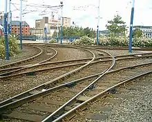 Tramway track consists of a grooved tramway rail set into a concrete base with troughs into which the rails are laid. Most of the track is on-street using 35G-section grooved tram rail, with BS11-80A 80 lb/yd (39.7 kg/m) flat-bottom rail elsewhere.[37] The railway track was supplied by British Steel Corporation Track Products of Workington and laid on sleepers consisting of concrete blocks with steel ties which gives a spring feeling when travelling on these sections. The track is laid on a bed of ballast which in turn rests on a prepared formation. Street crossings are usually laid with grooved tramway rails.